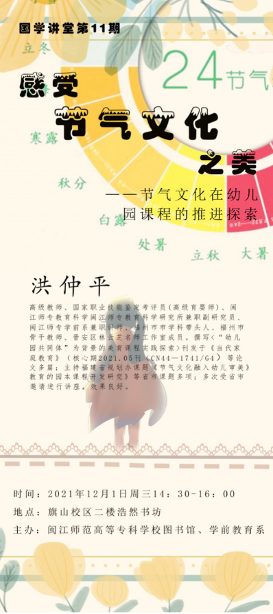 在广泛推行节气文化融入幼儿审美教育的园本课程的今天,为了让同学们更加了解“二十节气”的教育价值以及应该如何正确地将“二十四节气”的教育应用于幼儿园的传统文化教育中。12月1日下午,图书馆和学前教育系在旗山校区图书馆浩然书坊共同举办的《感受节气之美——节气文化在幼儿园课程的推进探索》讲座。本次讲座邀请高级教师、福州市市学科带头人、福州市骨干教师洪仲平老师授讲。图书馆馆员及学前教育系的同学们共同参加此次讲座。