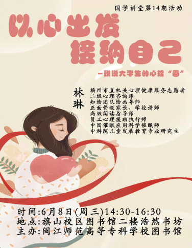 为了让大学生能够更全面地了解自己的内心,促进大学生心理健康良好的发展,我馆举办了以《以心出发,接纳自己—说说大学生心理“画”》为主题的大学生心理指导讲座,并于2022年6月8日下午在旗山校区图书馆二楼浩然书坊顺利举行。此次讲座邀请了福州市直机关心理健康服务志愿者、二级心理咨询师、知绘团队绘画导师林琳老师授讲。