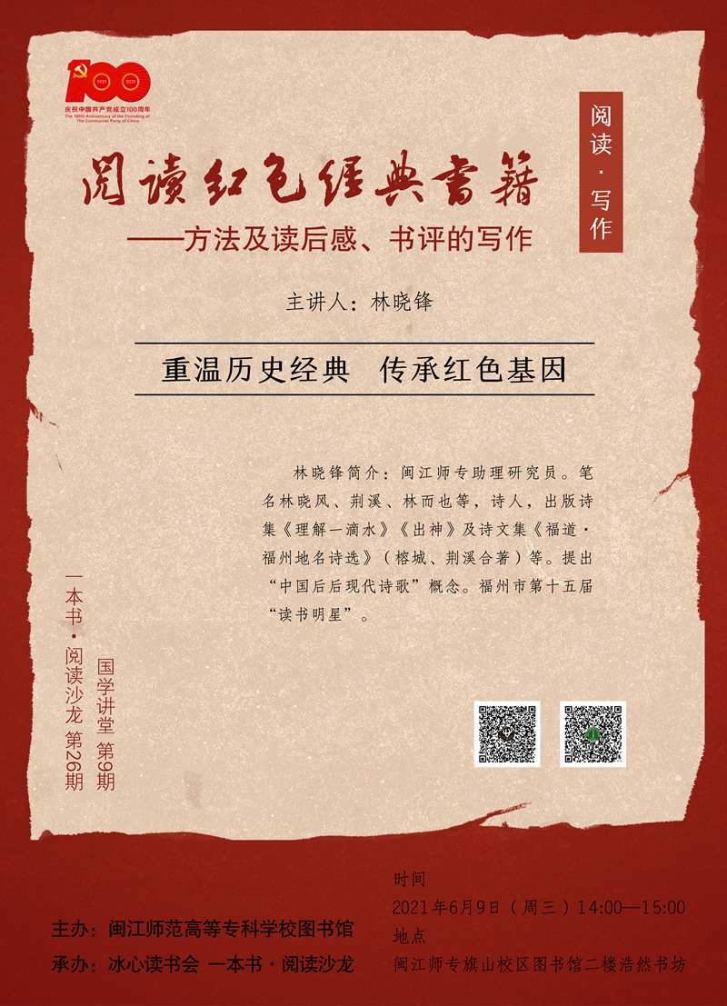 2021年6月9日下午,由图书馆主办、冰心读书会社团承办,国学讲堂第9期、一本书·阅读沙龙第26期《阅读红色经典书籍——方法及读后感、书评的写作》讲座活动在图书馆浩然书坊举行。此次讲座活动由图书馆林晓锋老师(兼冰心读书会社团指导教师)主讲,是为参加福州市第五届福建省大学生阅读红色经典书籍、撰写书评大赛活动的同学们而进行相关写作辅导,同时以此认真学习、提高写作能力的方式,庆祝中国共产党成立100周年。冰心读书会社团成员及参加福州市第五届福建省大学生书评大赛的同学参加了讲座活动。