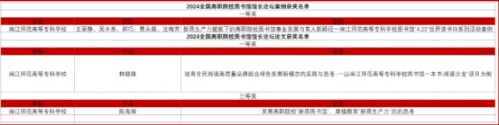 近日,由教育部高等学校图书情报工作指导委员会、高职高专院校分委员会及全国高职院校图书馆馆长论坛联合主办的2024年全国高职高专院校图书馆案例与论文征集评选活动圆满结束。我馆王丽静老师报送的案例《新质生产力赋能下的高职院校图书馆事业发展与育人新路径》、林晓锋老师报送的论文《培育全民阅读高质量品牌组合绿色发展新模态的实践与思考》均荣获一等奖殊荣,陈海娟老师报送的论文《发展高职院校“新质图书馆”,厚植教育“新质生产力”的思考》荣获三等奖。这是我馆在全国性评选活动中取得的又一显著成就。
