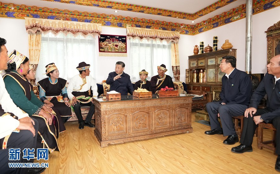 7月21日至23日,中共中央总书记、国家主席、中央军委主席习近平来到西藏,祝贺西藏和平解放70周年,看望慰问西藏各族干部群众。这是21日下午,习近平在林芝市巴宜区林芝镇嘎拉村,同村民达瓦坚参一家亲切交流。新华社记者 谢环驰 摄