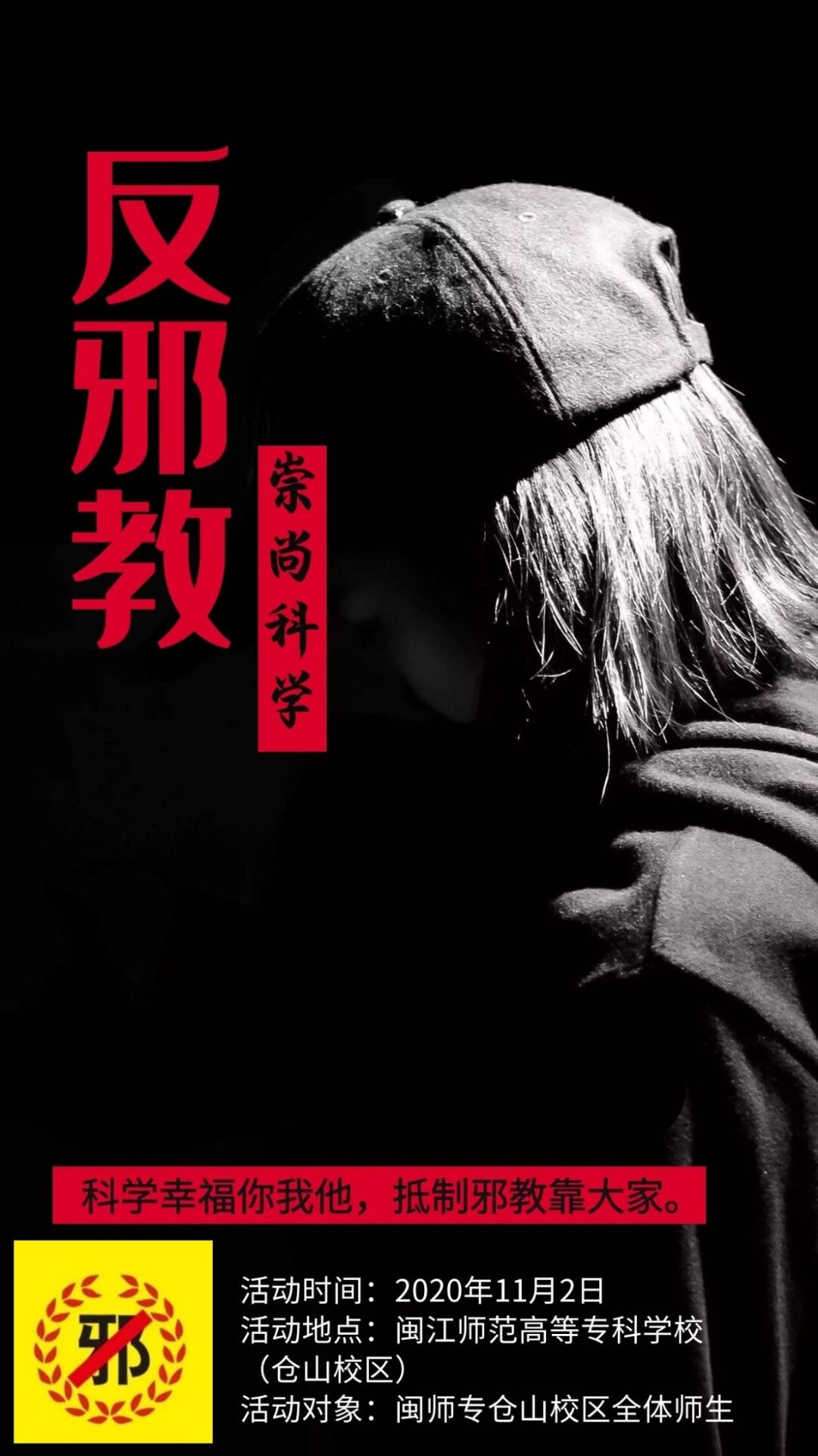 2020年11月2日,为进一步扎实推进大赢家体育app下载反邪教教育宣传工作、引导和教育广大师生掌握反邪教知识,增强防范、识别、抵制邪教侵蚀的意识和能力,提高大赢家体育app下载师生的反邪教意识。大赢家体育app下载青年志愿者协会邀请仓山校区全体师生参加“崇尚科学,反对邪教”活动。