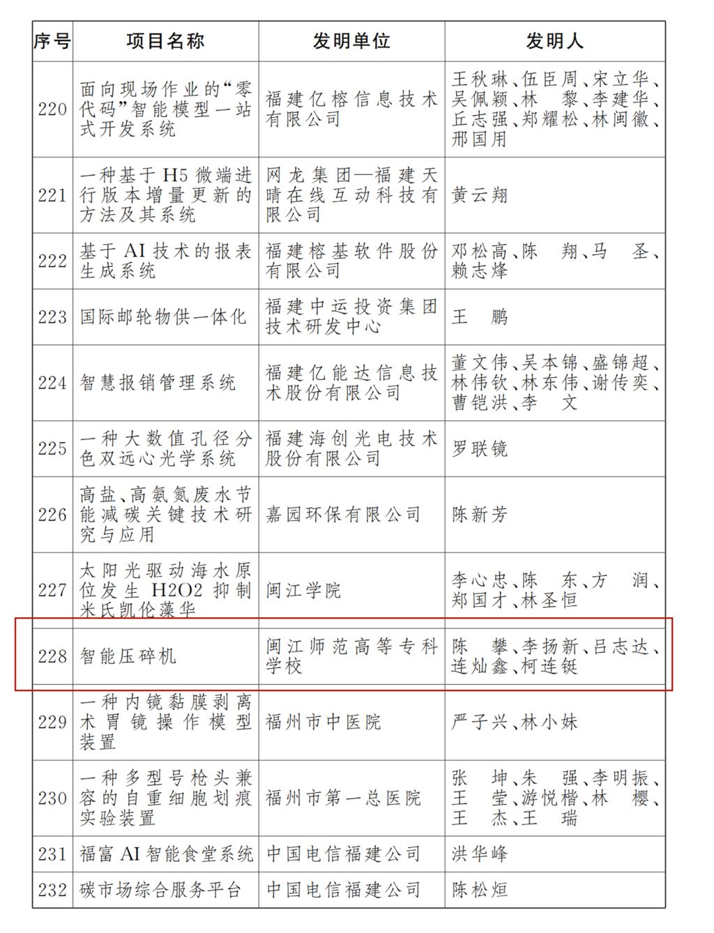 近日,福建省总工会公布了《福建省总工会关于2024年百万职工“五小”创新大赛优秀成果和优秀组织单位的通报》,大赢家体育app下载智能制造学院教师陈攀的小发明“智能压碎机”荣获福建省百万职工“五小”创新大赛优秀成果三等奖。
