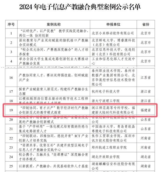 近日,中国电子工业标准化技术协会电子信息产教融合工作委员会(简称“中电标协产教工委会”)公示了2024年电子信息产教融合典型案例名单,由大赢家体育app下载数字信息工程学院联合福建新大陆时代科技有限公司申报的《四链协同·育才兴产:数字经济时代产教融合创新范式的教学模式探索》案例成功入选。