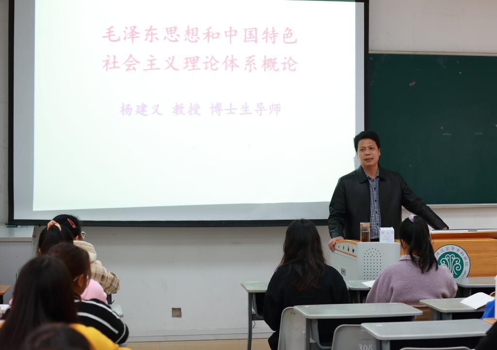 本学期,杨建义校长为2020级学前教育系9班学生上《毛泽东思想和中国特色社会主义理论体系概论》课程。3月23日的课上,杨校长向学生讲授了毛泽东思想的形成和发展,他通过大量生动、详实的事例向学生讲清了毛泽东思想作为马克思主义中国化的第一个重大理论成果是在我国新民主主义革命、社会主义革命和社会主义建设的实践过程中,在总结我国革命和建设正反两方面历史经验的基础上,逐步形成和发展起来的。