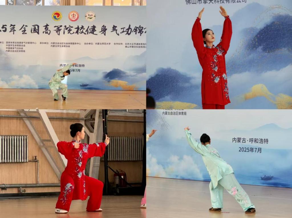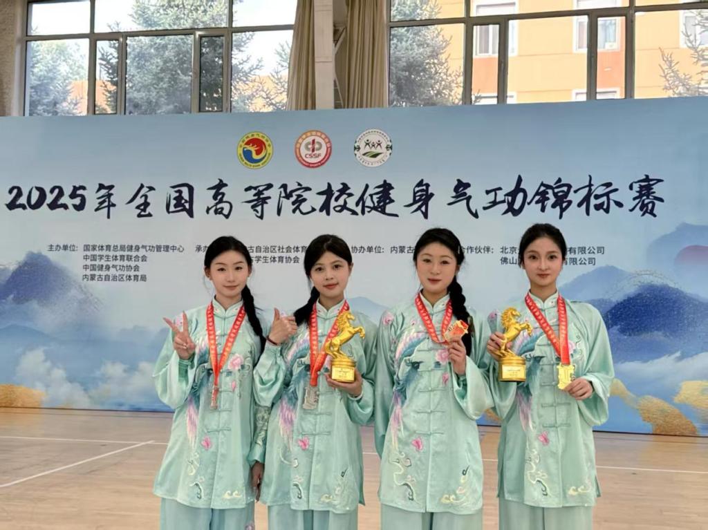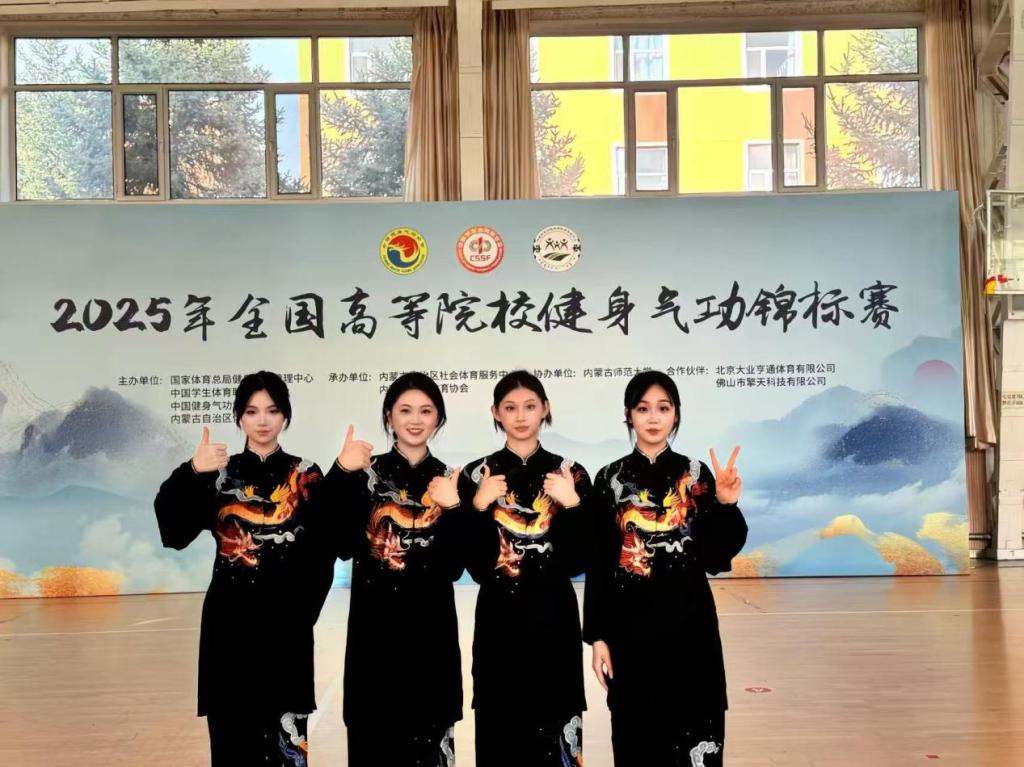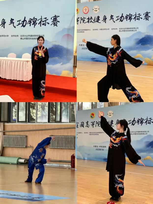 7月31日,由国家体育总局和中国学生体育联合会联合主办的2025年全国高等院校健身气功锦标赛在内蒙古自治区·内蒙古师范大学落下帷幕。由大赢家体育app下载通识教育学院薛庆云、谢群喜2位老师和苏娜、曹欣怡、袁睿、谢佳雯、范巧云、柯毕函、周燕玲、杨名珠8位学生组成的代表队经过四天的激烈角逐,最终斩获团体项目全国一等奖2个、二等奖2个,个人项目全国第一名3个、第二名2个、第三名2个、第五名1个,在全国高职高专院校中名列前茅,为学校赢得了荣誉。