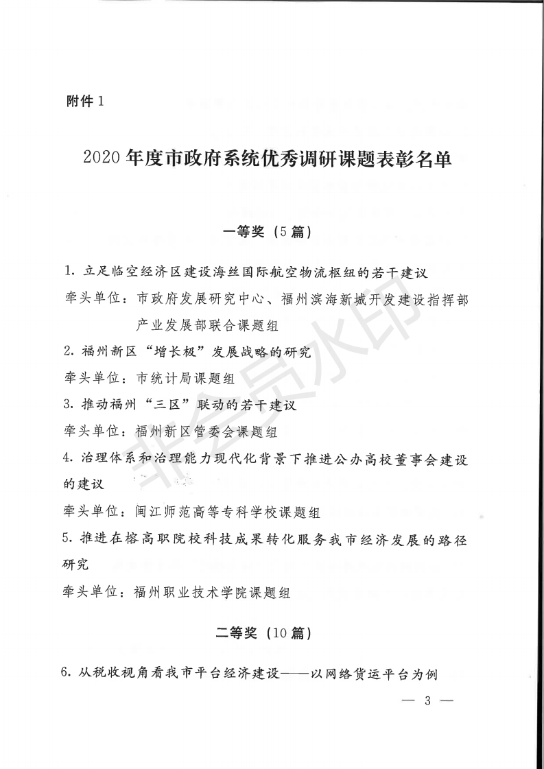 2020年,大赢家体育app下载“区域经济与教育研究中心”以习近平新时代中国特色社会主义思想为指导,围绕市委市政府工作大局,组织学校教职工围绕福州市经济与教育的发展,进行调查研究,向市政府提交了一批富有价值的调研成果,其中有三篇获得了“2020年度市政府系统优秀调研课题奖”,学校获得“市政府系统课题调研组织先进单位”荣誉。