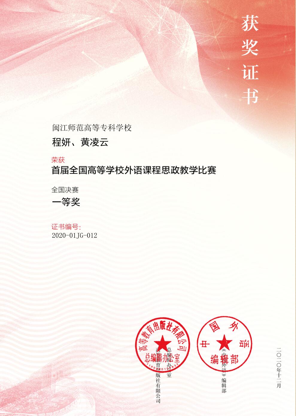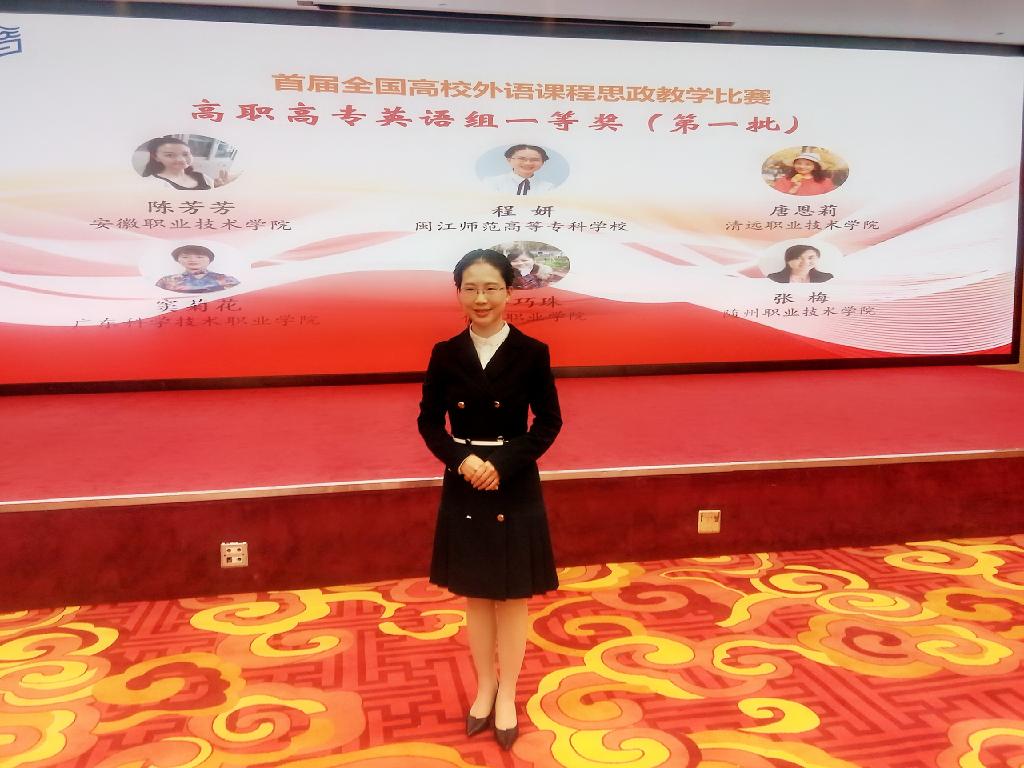12月18日-21日,由高等教育出版社与《中国外语》编辑部共同举办的“首届全国高等学校外语课程思政教学比赛”现场决赛在北京举行,外语系程妍和黄凌云组成的教学团队荣获高职高专组一等奖。