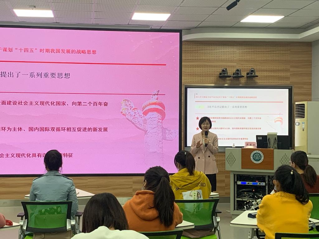 吴春艳老师在宣讲中紧扣习近平总书记在党的十九届五中全会上的重要讲话和全会通过的《建议》,从深入学习领会习近平总书记的战略思想、深刻认识新发展阶段、准确把握远景目标和“十四五”时期主要目标及重点任务、牢牢把握构建新发展格局、坚持党的全面领导等五个方面,从历史和现实、理论和实践等角度生动宣讲了党的十九届五中全会精神,并对习近平总书记在全会上提出的一系列新思想、新观点、新论断、新要求进行了详细阐述。