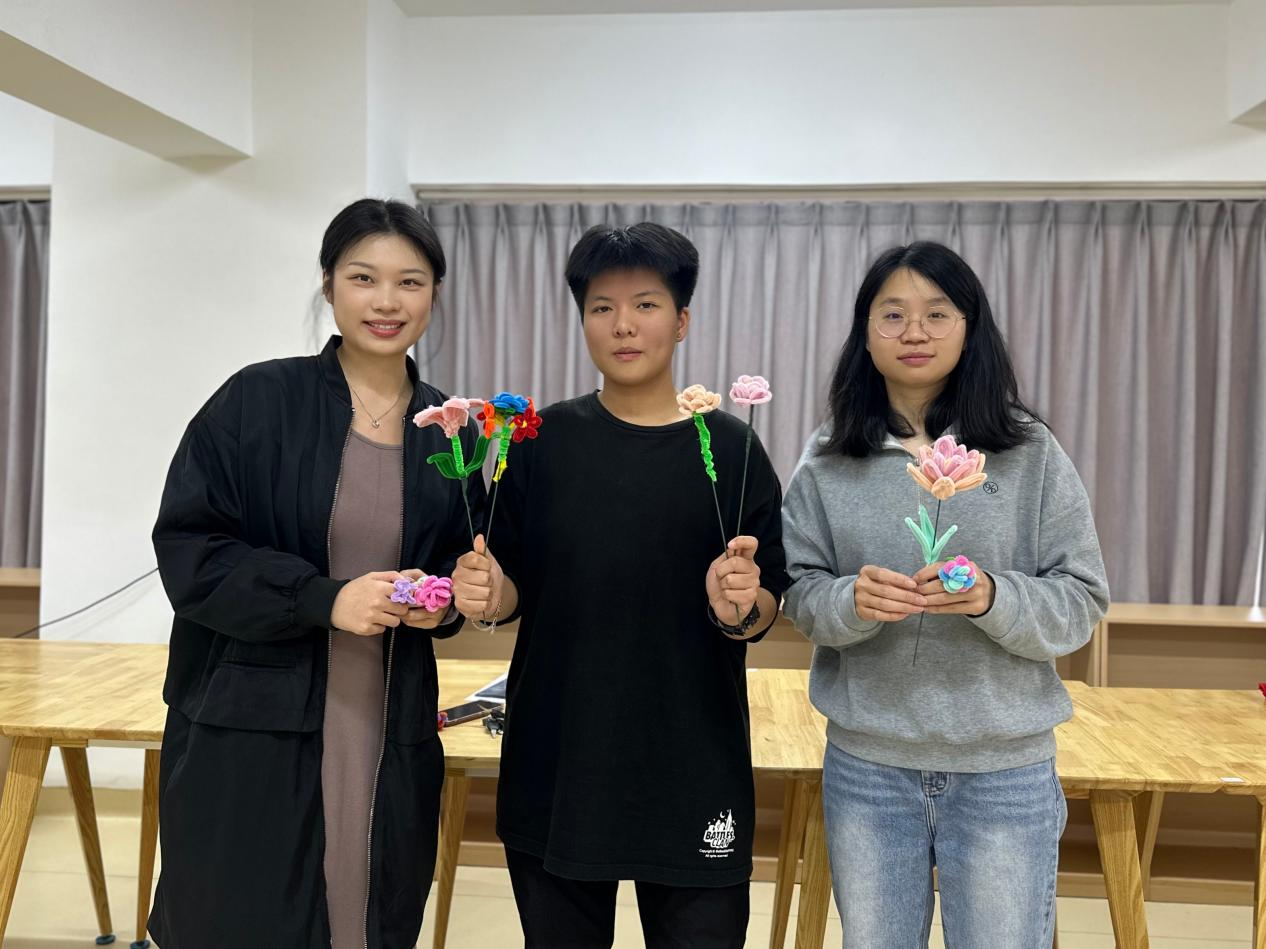 彩色扭扭棒在志愿者指尖灵活巧妙地翻转,不多时,便变成了一朵朵娇艳欲滴的花朵。每一朵花都凝聚着志愿者们的奇思妙想与深切爱心。制作完成后,志愿者们将饱含心意的花束送给班主任和辅导员,诚挚地表达对老师们日常辛勤付出的感激之情。