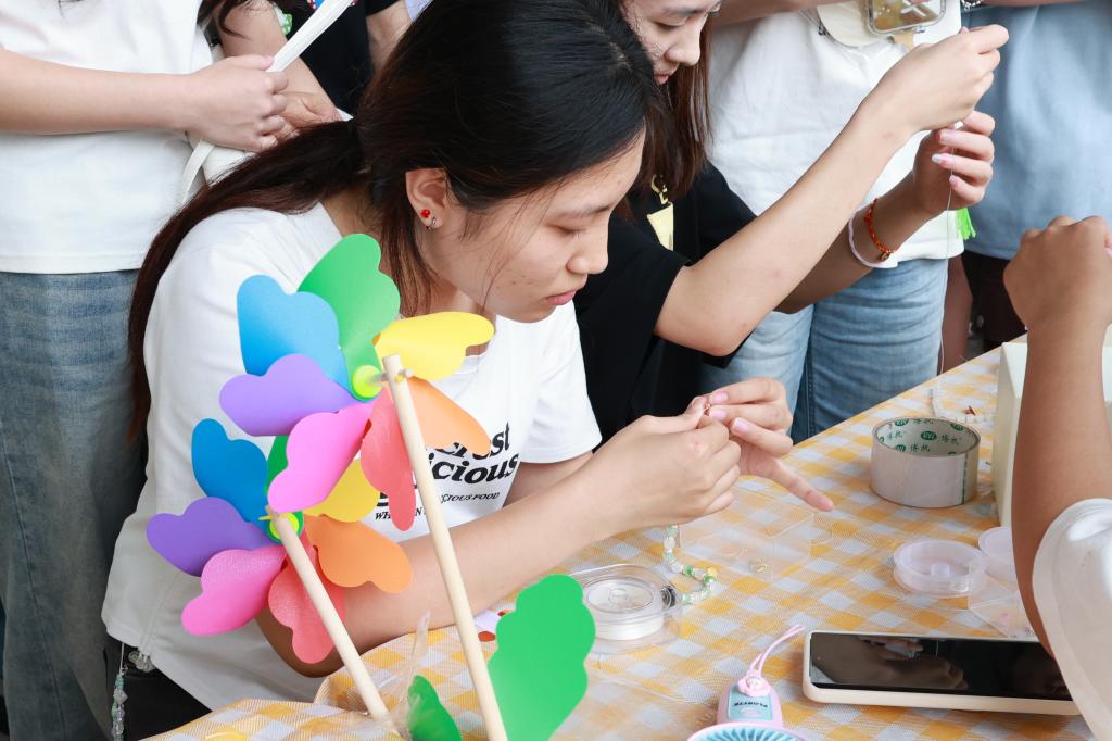 本次游园会设置了六大童趣关卡和两大手作工坊体验区。六大关卡各具特色,有推动饮料瓶定乾坤的“好运滚滚乐”,精准投射赢积分的“趣味套圈圈”,考验技巧与耐心的水上漂移计时赛“吹球大作战”,智慧比拼的“灯谜猜猜乐”,以及筷子夹红豆的“红豆妙手侠”和纸飞机投掷竞技的“纸翼飞扬赛”。两大手作工坊也备受青睐,在“珠光宝串”区,师生们用五彩珠子串出专属手链、项链;“彩漆扇艺”区,大家旋转团扇沾取彩漆,让团扇变得绚丽多彩。