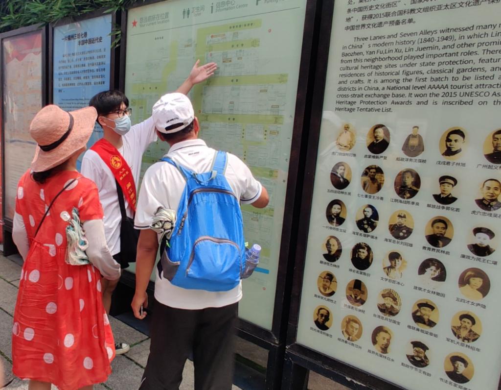 活动现场,学生以小组为单位,在三坊七巷的南后街、林觉民冰心故居、二梅书屋、林则徐纪念馆等主要景点,为游客提供现场志愿讲解服务。学生根据课堂所学知识,融入自己对三坊七巷历史文化内涵的理解,为游客们讲解千年坊巷格局中的历史变迁与名人典故,语言朴实但内容丰富,收获了在场游客的一致好评。