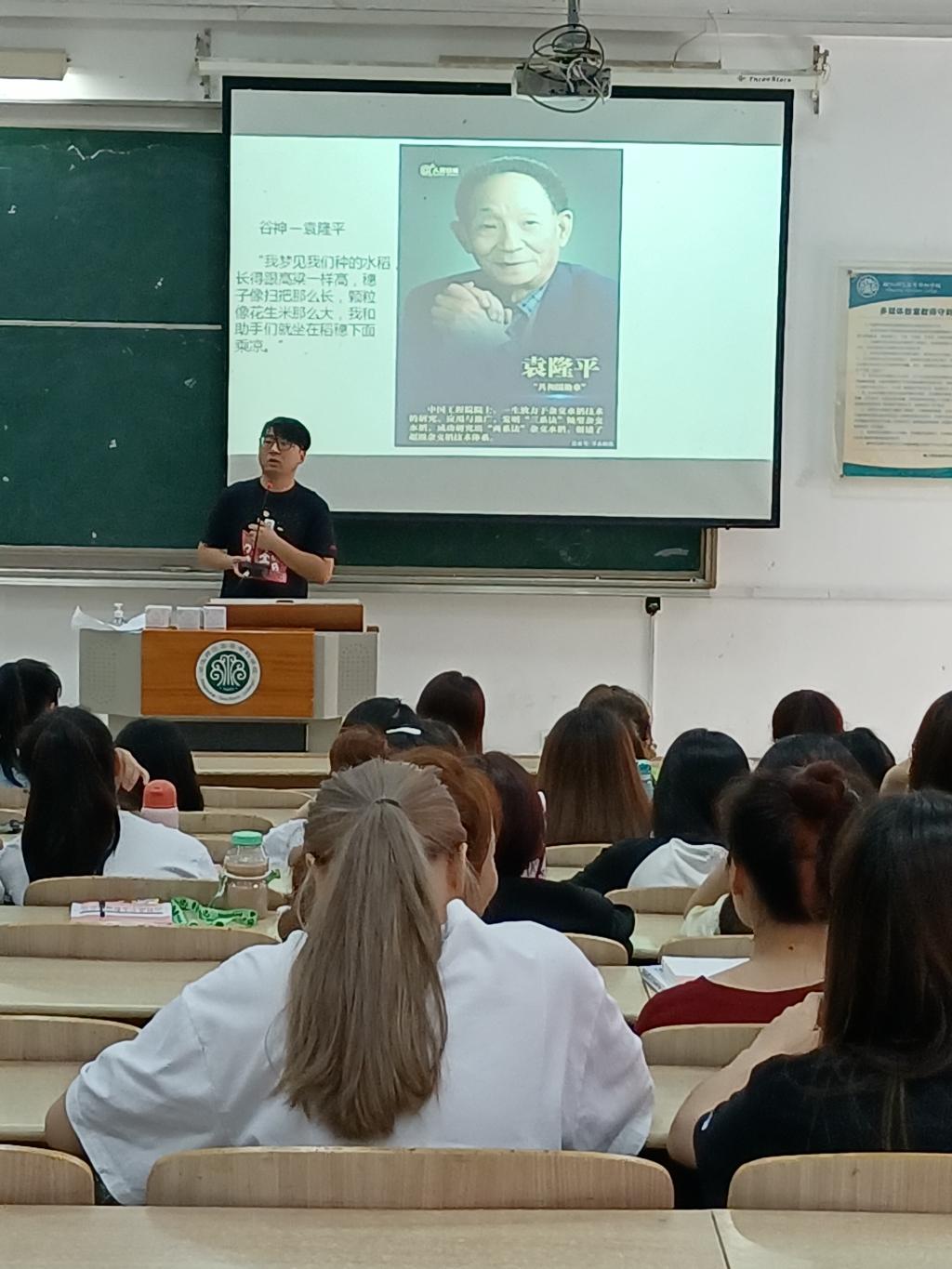 5月23日中午,系党总支青年委员、团委书记、学生党支部书记周宇航在旗山校区为艺术系20级全体学生上了一堂《那些国士无双的功勋们》主题课。他首先讲授了“共和国勋章”获得者袁隆平爷爷的生平事迹,并带领全体学生起立为袁隆平爷爷默哀。默哀仪式结束之后,他继续分享了两弹元勋邓稼先、火箭之父钱学森、现代印刷术之领军人物王选、嫦娥之父欧阳自远、中国首位科学类诺贝尔奖获得者屠呦呦、抗疫英雄钟南山等大国功勋的伟大贡献,并鼓励同学们努力做到学史明理、学史增信、学史崇德、学史力行。
