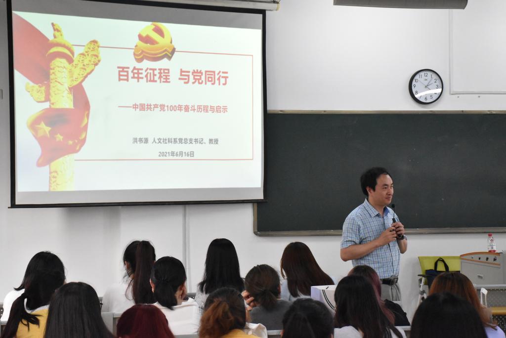 6月16日下午,人文社科系党总支书记洪书源在3#504教室为2019级心理咨询专业、文秘专业学生上了一堂题为《百年征程与党同行—中国共产党100年奋斗历程与启示》的形势与政策课。