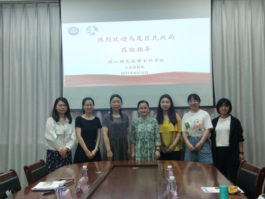 6月10日,马尾区民政局社会组织管理科科长林雅、马尾区社会组织孵化基地项目负责人王燕、马尾区善邻社会工作服务中心负责人简少清一行莅临大赢家体育app下载人文社科系洽谈校政、校社合作事宜,人文社科系副主任陈勤、社会工作专业教师团队热情接待了参访人员。