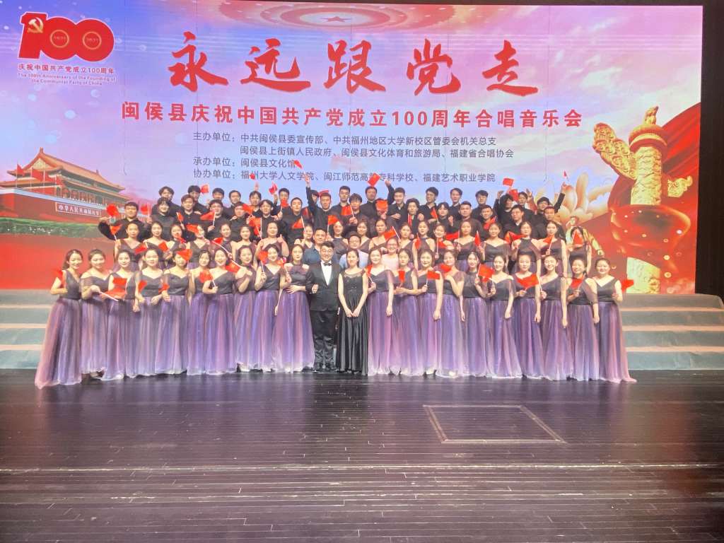 6月27日,我系繁星合唱团应邀参演由中共闽侯县委宣传部、中共福州地区大学新校区管委会机关总支、闽侯县文化体育和旅游局、福建省合唱协会主办,闽侯县文化馆承办的“永远跟党走”闽侯县庆祝中国共产党成立100周年合唱音乐会,本次音乐会在福州大学城文化艺术中心大剧场激情唱响。闽侯县领导黄诗杨、曾玉、叶玲,闽江师专艺术系主任徐青、副主任方晶、以及各相关部门领导和市民共同到场聆听音乐会。