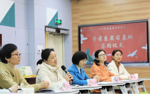 吴春艳真诚感谢园所及企业代表们积极共同搭建学生实践优质平台,助力专业化、技能型的学前教育与早期教育人才培养。接着对学前系的人才培养模式作简要介绍,分享学前系学子参赛获奖成果。她指出,教育教学实践是高校课堂教学的延伸,是高校专业实践教学的重要环节,我系高度重视校外实习实践基地建设。此次与园所及企业代表签订教育实习基地建设协议将会为培养职业素质高、专业技能强的优秀教育业人才打下坚实的基础。