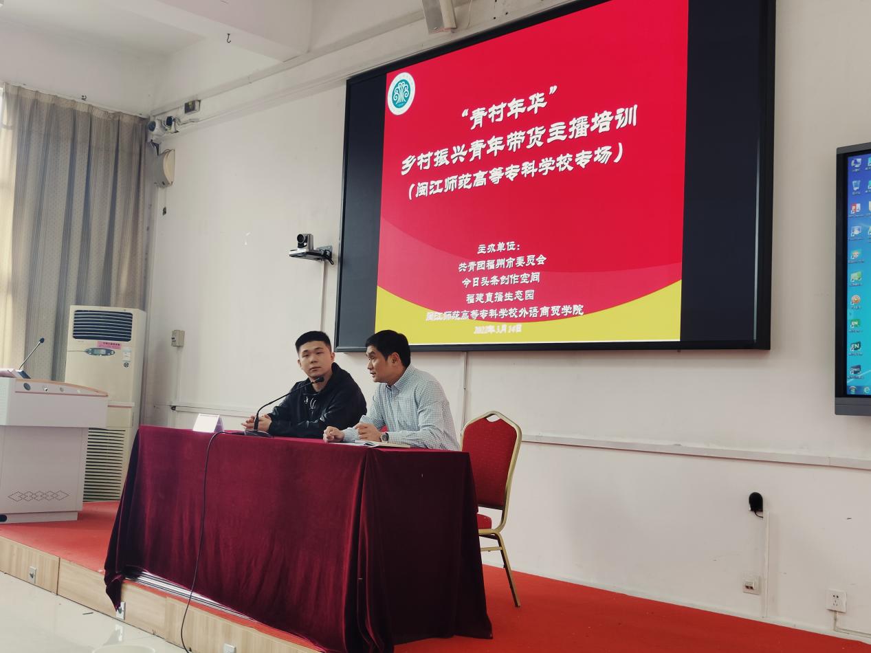 为深入学习贯彻习近平总书记来闽考察重要讲话精神和总书记关于青年人才工作的重要论述,全面落实市委主要领导关于进一步培养福州本土乡村振兴带货主播有关指示和部署,助力福州乡村振兴事业建设,3月14日,外语商贸学院与共青团福州市委员会、今日头条创作空间、福建直播生态园联合举办“青村年华”乡村振兴青年带货主播培训大赢家体育app下载专场。培训邀请北大青创营导师、头条学堂认证讲师刘志楠为大家授课。外语商贸学院党总支副书记林冉、综合科科长刘诗雨出席本次活动,大赢家体育app下载学生代表参加本次培训。
