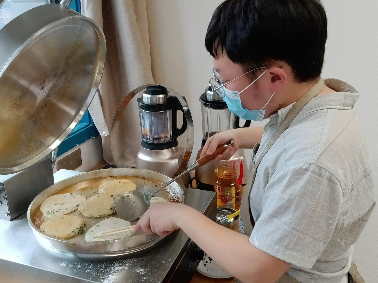 附小的孩子们第一次走入厨房亲手烙饼,每个人的脸上都洋溢着快乐的笑容。他们认真地学习怎么制作葱油饼,在志愿者的帮助和指导下学会和面、擀面和煎饼。孩子们在不断尝试中逐渐熟练,面团也在他们的手中慢慢成型。