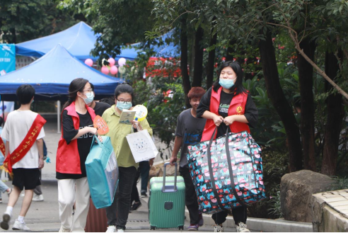 一辆辆巴士往来于新生接送点和报到点,搭载着满怀对象牙塔的期待和兴奋的萌新到达校园;身披绶带和红马甲的志愿者,热情主动地为萌新们运送行李,引导至班级报到点;新生辅导员、班主任、助导和志愿者们,耐心细致为新生办理报到手续,发放新生礼包,热烈欢迎新生到来。迎新现场,红旗飘扬,气氛热烈,秩序井然,迎新工作顺利开展。
