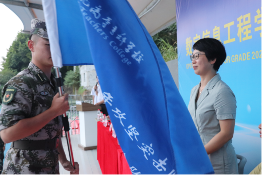 典礼上还举行了新生佩戴校徽仪式,主席台上领导和老师为新生代表佩戴校徽,台下的全体新生也将校徽佩戴在胸前,希望2022级全体新生以这枚徽章为荣,努力为学校争光添彩。随后还进行了新生班级授旗仪式,12名新生班级班长庄严地接过班旗,感受着归属感和责任感的传递。在学院党委书记陈欣宣读完批复后,陈群为退役大学生士兵青年攻坚突击队数字信息工程学院分队授旗,突击队将在国防教育、军事训练、校园文化建设、应急保障等工作中发挥应有用。