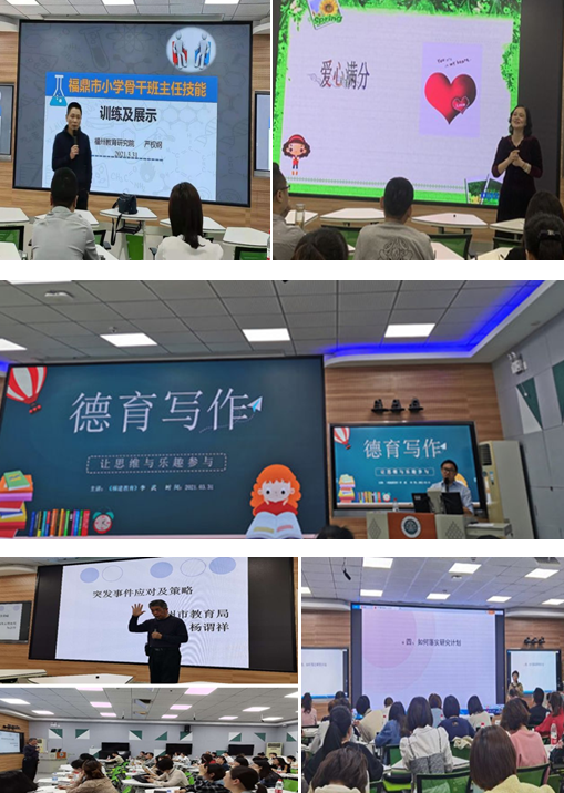 我们为大家安排了多场精彩的专家及名师讲座,有福州教育研究院严权纲老师的《班主任的人本初心》《福鼎市小学骨干班主任技能训练与展示》,指出教育的核心是人的教育 ,教育面向的是未来人,面对的是现代人,在教学中,要转变观念 ,关注"中下″学生 ,做好生命教育,培养教育智慧。有福州金山小学林碧珍校长和乌山小学杨彦伟校长带来的《小学生规则养成教育的实践与探索》,深入浅出,成员间小组合作学习 ,在头脑风暴中解决当下教育教学中的十个问题。有福州市教育局的杨谓祥老师为我们带来的《突发事件应对及策略》,通过多个学校突发事件的实例,让我们直观认识到学校突发事件处理知识的重要性。有福建省教科所郭少榕老师为我们带来《德育课题研究》的讲座,整个过程郭老师理论引领,案例分析,以精彩的实例和生动的语言为一线老师指明了德育课题研究的方向。还有福建教育德育副主编李武主任给我们作《德育写作》的专题讲座,李主任围绕“价值探索、困境观察、策略进阶”三个方面详尽细致的展开分析,讲座内容紧扣教师论文研究中遇到的困惑点与疑难点,有非常强的针对性、指导性、实用性。