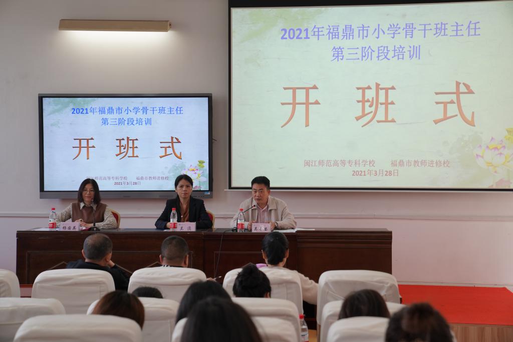 3月的榕城,春意盎然 ,大赢家体育app下载迎来了开春第一个培训班。3月28日上午,福鼎市小学骨干班主任第三阶段集中培训班在大赢家体育app下载正式开班,福鼎市进修学校吴平安副校长,大赢家体育app下载继教中心兰浈主任参加了开班式,作为此次培训班教学班主任的杨国英老师进行主持。