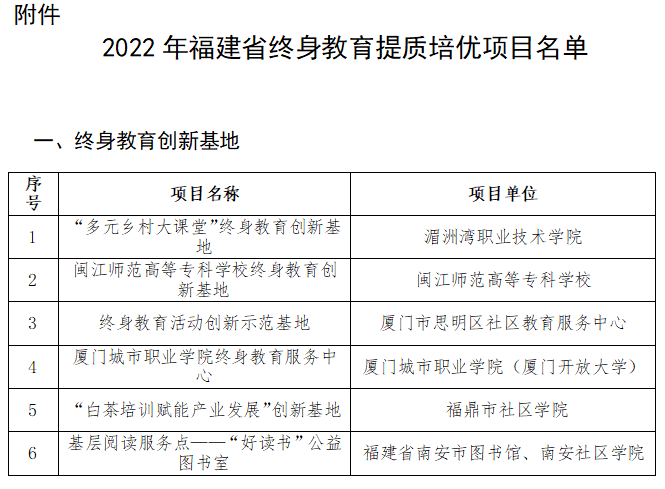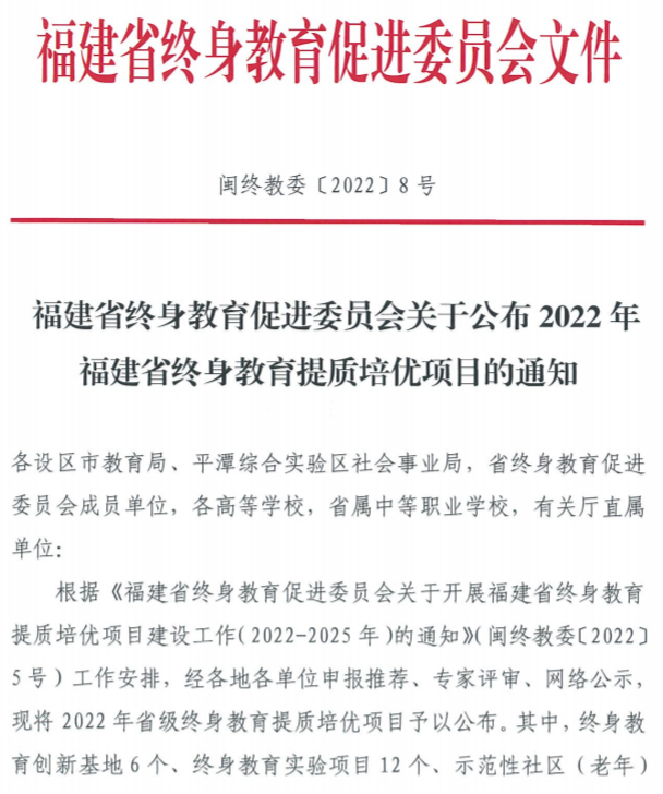 日前,根据《福建省终身教育促进委员会关于公布2022年福建省终身教育提质培优项目的通知》(闽终教委〔2022〕8号),大赢家体育app下载喜获“福建省终身教育创新基地”。今年年初,福建省教育厅将“立项建设6个省级终身教育创新基地”列为2022年工作要点。