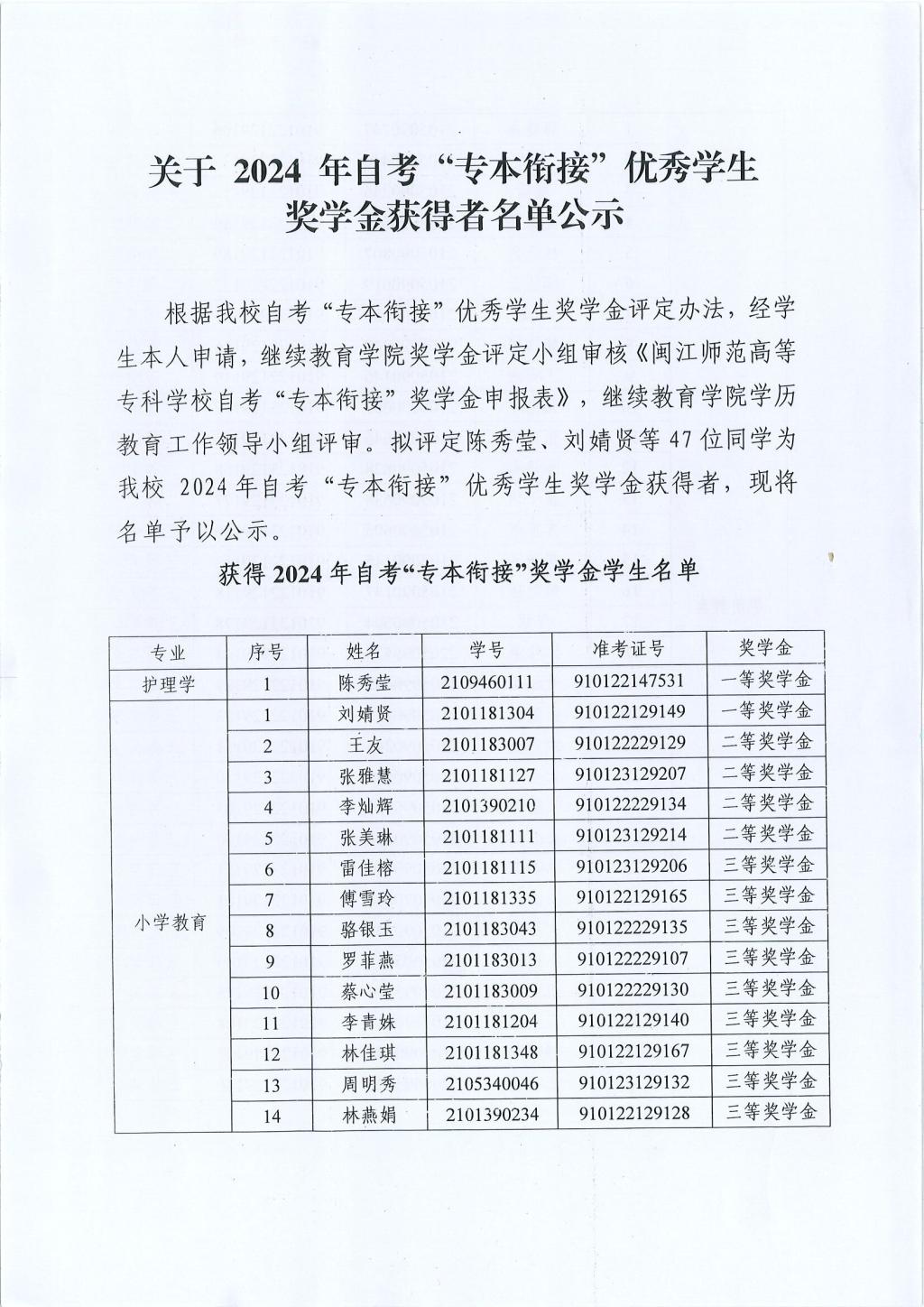 关于2024年自考“专本衔接”优秀学生奖学金获得者名单公示