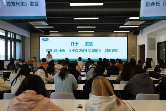 副会长叶磊代表校友讲话,她对外语商贸学院校友分会的成立表示祝贺,对老师的教导与母校的栽培表示感谢,并为闽江师专即将到来的120周年校庆送上祝福。
