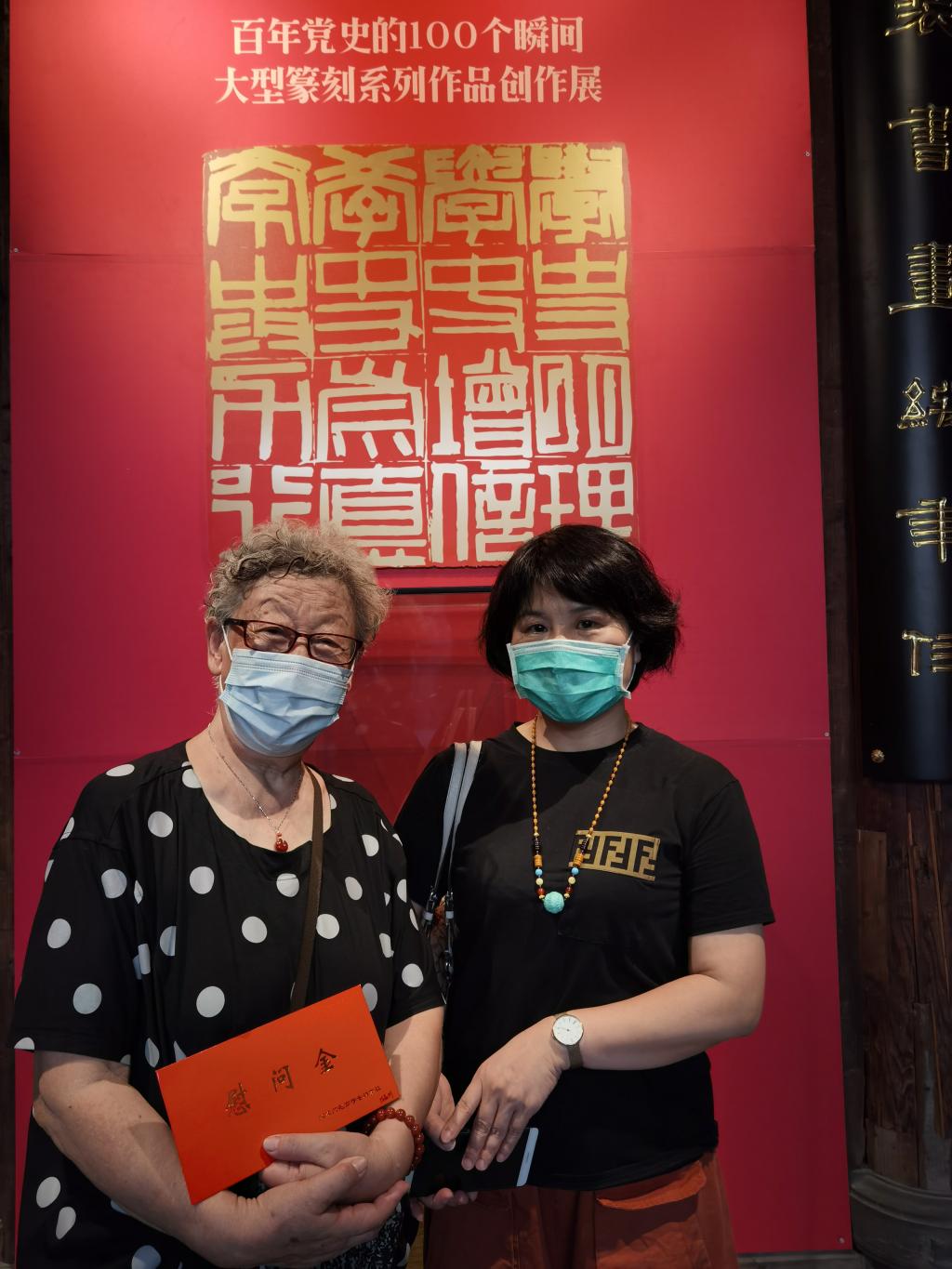在参观展览过程中,欧键汶老师向大家逐一详细介绍了每年创作的主题思想与篆刻书写的含义,紧紧围绕“新民主主义革命时期、社会主义革命和建设时期、改革开放和社会主义现代化建设时期、新时代中国特色社会主义时期取得的辉煌成就”等主题旋律与重大事件,将党的百年历史长卷以特有的艺术表达方式栩栩如生地呈现在大家面前。大家在鉴赏艺术的过程中,重温中国共产党“筚路蓝缕,百年芳华”的历史征程,感受颇深,发出由衷地赞美。