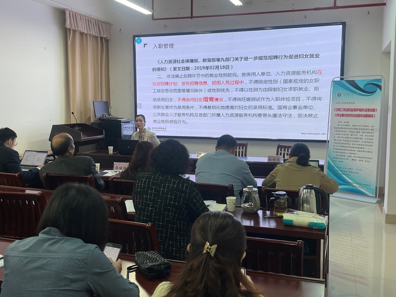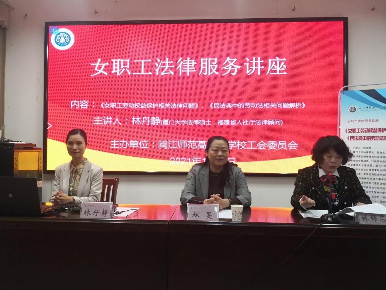 为进一步推进工会法治化建设,营造和谐劳动关系氛围,充分发挥法律服务在构建和谐社会中的作用,加强女职工法律服务工作,11月3日下午,校工会、女工委积极响应福州市总工会开展“送法下基层”活动要求,采取“点单+精准送课”模式,邀请厦门大学法律硕士,福建省人社厅法律顾问林丹静律师作《女职工劳动权益保护相关法律问题》、《民法典中的劳动法相关问题解析》专题讲座。校党委委员、副校长、工会副主席林旻出席会议,女工委干部和女职工代表参加会议。讲座由校工会常务副主席、女工委主任林锦芯主持。