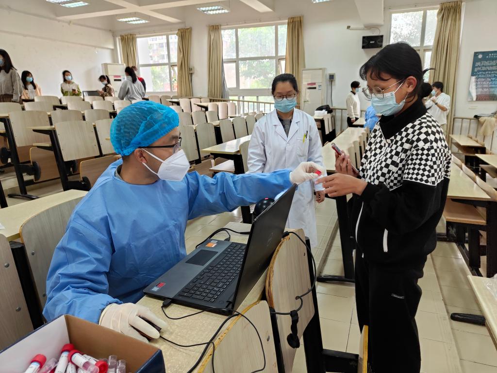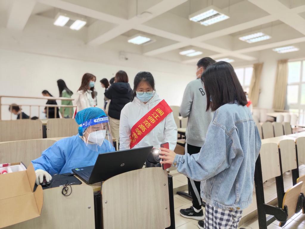 “看到身边很多人都报名了志愿者,我加入了他们。这是我第一次参与到核酸检测的志愿服务队伍当中,除了忙着问同学们的学院信息、维护一米间隔秩序和提醒提前出示预约码,还有指引队伍、协助录入个人信息……一整个下午在忙碌中过去了,我们也体会到了医护人员的辛苦,在日常生活中做好个人防疫的同时更应该配合支持他们的工作。”一名参加志愿工作的党员在核酸检测结束后感慨道。
