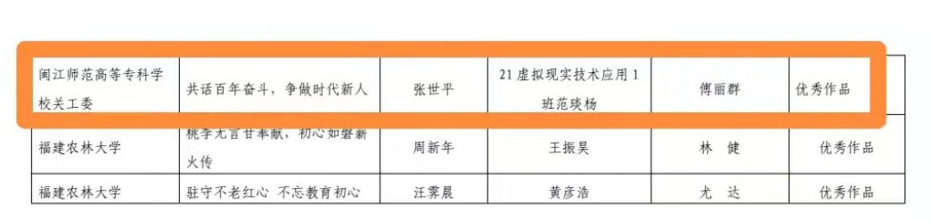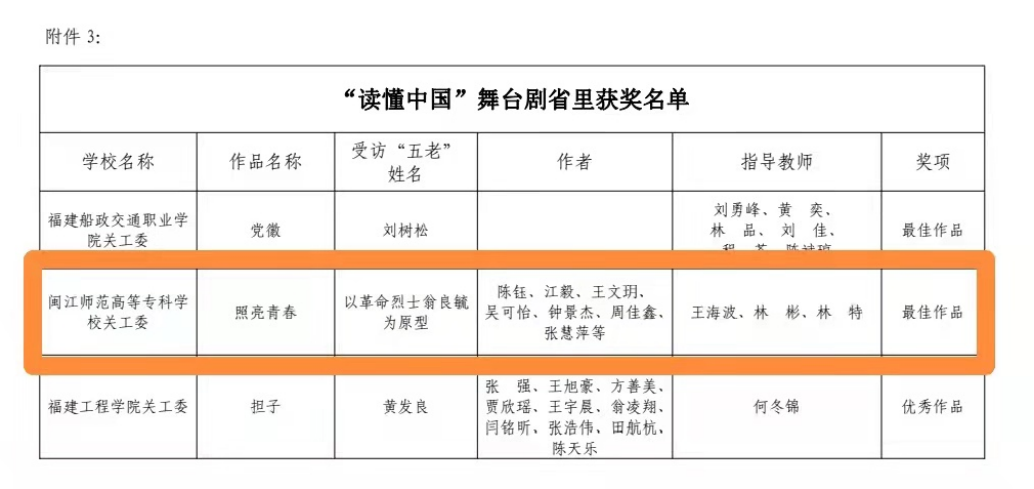近日,福建省关工委印发《关于公布2022年“读懂中国--共话百年奋斗,争做时代新人“征文、微视频、舞台剧全国和我省评审结果的通报》(闽教关工委〔2022〕29号),大赢家体育app下载舞台剧《照亮青春》获得舞台剧最佳作品奖,征文《薪火传承,走向复兴》获征文优秀作品奖,微视频《共话百年奋斗,争做时代新人》获微视频优秀作品奖。