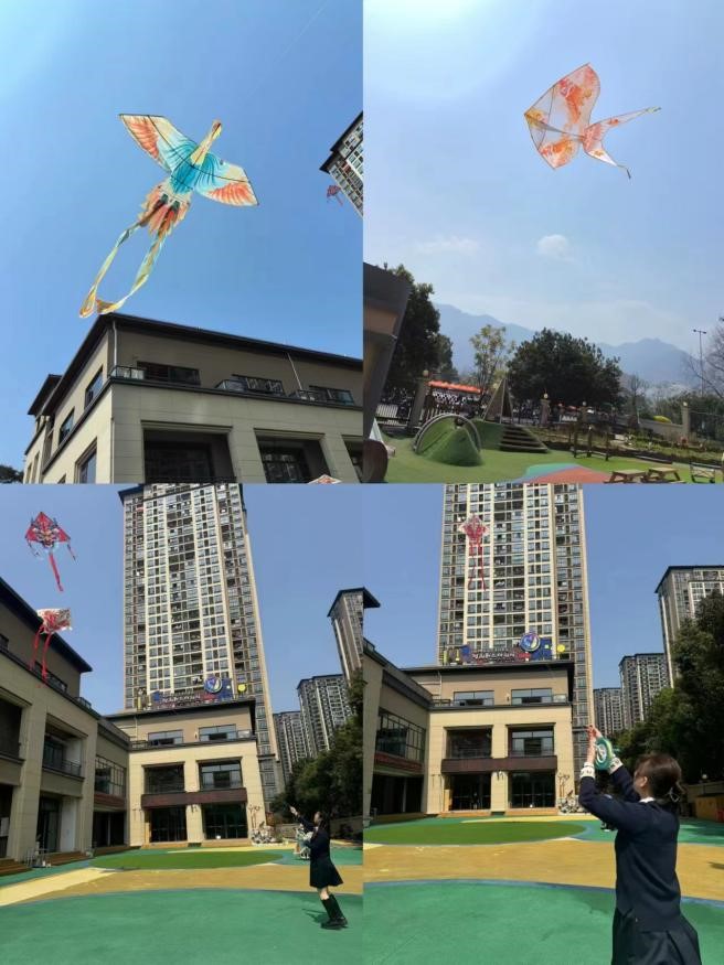 老师们在幼儿园的上空放飞风筝,风筝像鸟儿,自由自在的在幼儿园的上空飞翔。