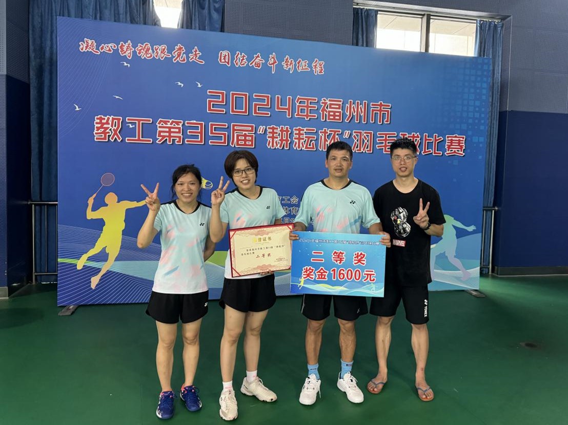 5月25日至5月26日,由市教育工会组织的第35届福州市教工“耕耘杯”羽毛球比赛在福州工人文化宫举行。大赢家体育app下载教工羽毛球协会成员陈杰(男单)、林雅婷(女单)、李劲和陈清钰(混双)组成代表队参赛,在61支参赛队伍中,一路披荆斩棘,拼进决赛,最终获得二等奖的佳绩!