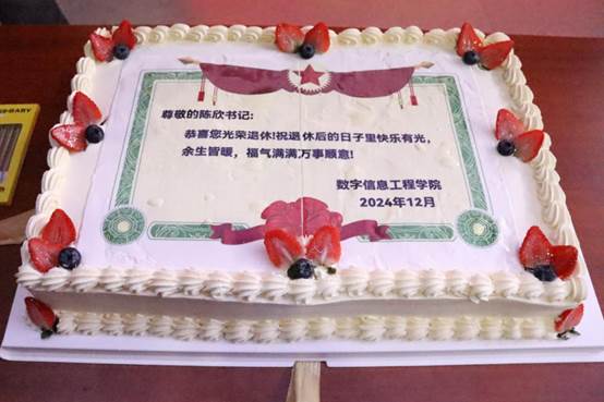 为深入贯彻落实习近平总书记关于老干部工作的重要指示批示精神,切实增强退休人员的荣誉感、自豪感和归属感、使命感,12月4日下午,数字信息工程学院在仓山校区2号楼305开展“岁月映初心·荣休敬韶华”光荣退休欢送座谈会,会议由学院院长朱发财主持,校党委副书记谢敏峰、组织部部长马梅铃、全体数字信息工程学院教职工温情欢送学院党委书记陈欣同志光荣退休。