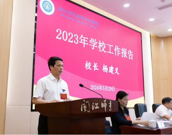 校党委副书记、校长杨建义作题为《夯基础 强内涵 奋力推进学校高质量发展》的工作报告。报告全面回顾了2023年学校的主要工作和取得的优异成绩,并对2024年学校工作重点进行部署。他指出,要以立德树人为根本任务,着力构建全方位育人体系;要以深化教育教学改革为抓手,全面提高人才培养;要以教育家精神为引领,强化高素质教师队伍建设;要以共谋发展为依托,全面推动开放办学水平;要以强化办学条件支撑为重点,着力提升服务保障能力。