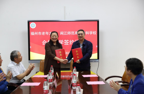 市老年大学副校长刘丹峰与闽江师专副校长林旻签订联合办学协议。