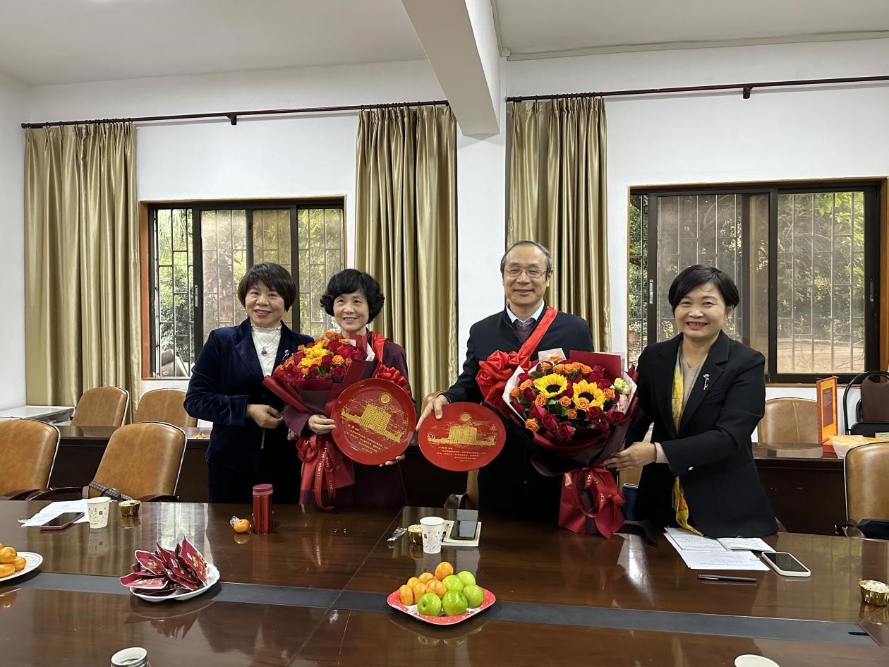 林锦芯和蔡勤为退休老师颁发了退休纪念品,并献上鲜花,合影留念。