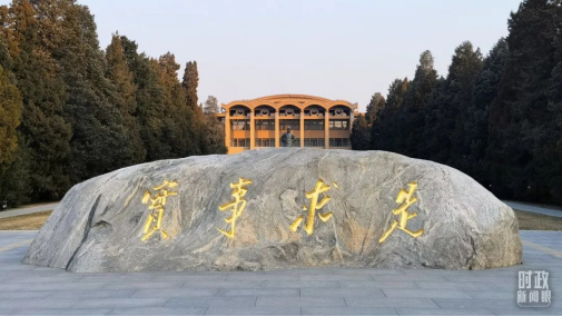 △中央党校内,毛泽东同志题写的“实事求是”校训。(总台央视记者石丞拍摄)