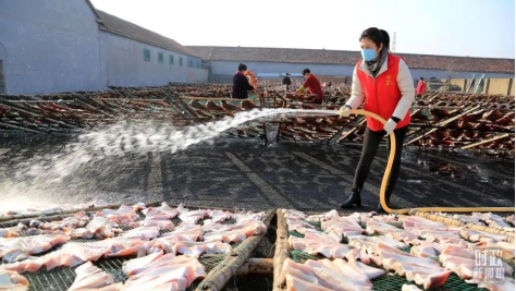 △2022年11月,江苏连云港的年轻干部正在帮助当地村民晾晒鳐鱼干。
