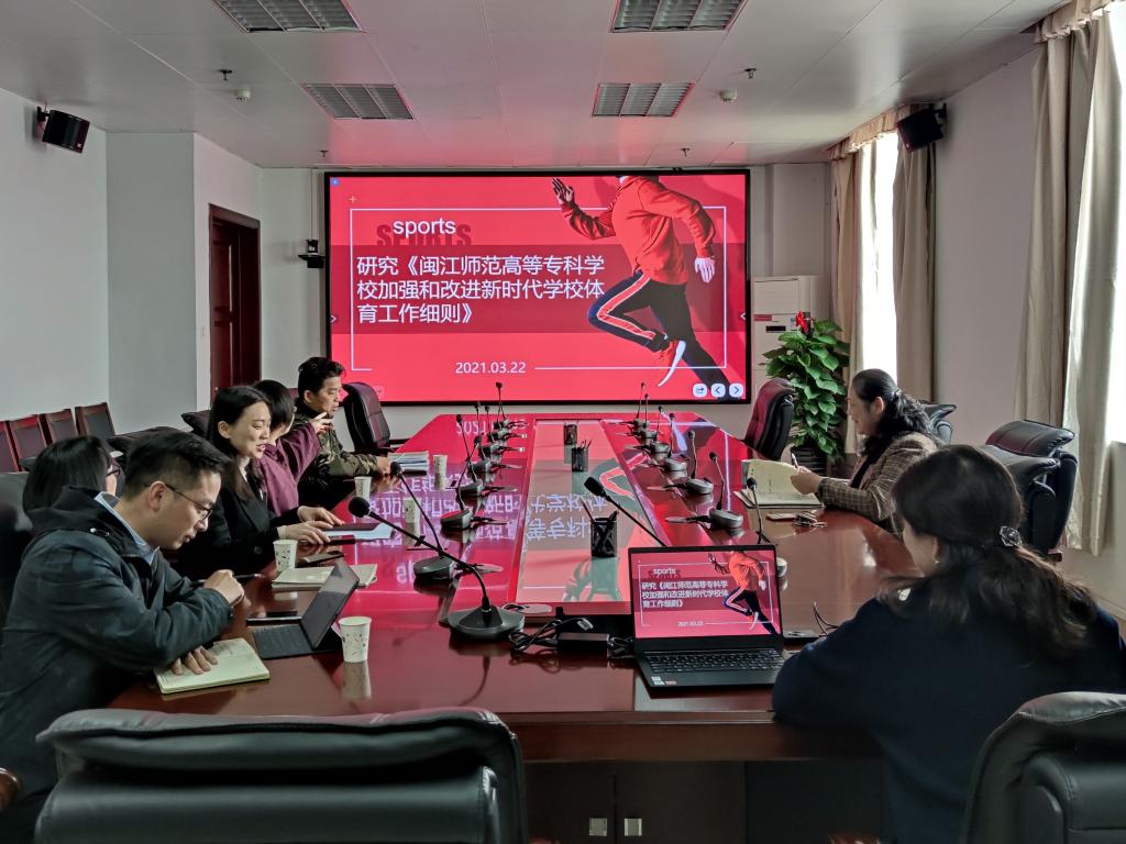 为了贯彻落实习近平总书记关于教育的重要论述和全国教育大会精神,切实加强新时代高等学校体育工作,根据国务院办公厅《关于全面加强和改进新时代学校体育工作的意见》文件精神。3月22日下午大赢家体育app下载就《加强和改进新时代学校体育工作实施细则》这份文件进行研讨,会议由林旻副校长主持。