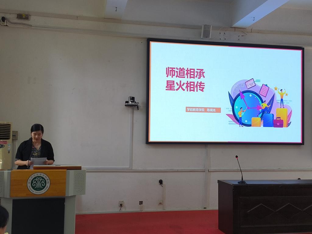 会上,导师代表学前教育学院副院长陈闽光以《师道相承 星火相传》为题讲述了对师徒关系的理解,并希望更多的年轻教师借助师徒结对这一平台迅速成长并享受其中的快乐,同时祝愿老教师们“踏遍青山人未老,风景这边独好”,新教师们能“桐花万里丹山路,雏凤清于老凤声。”