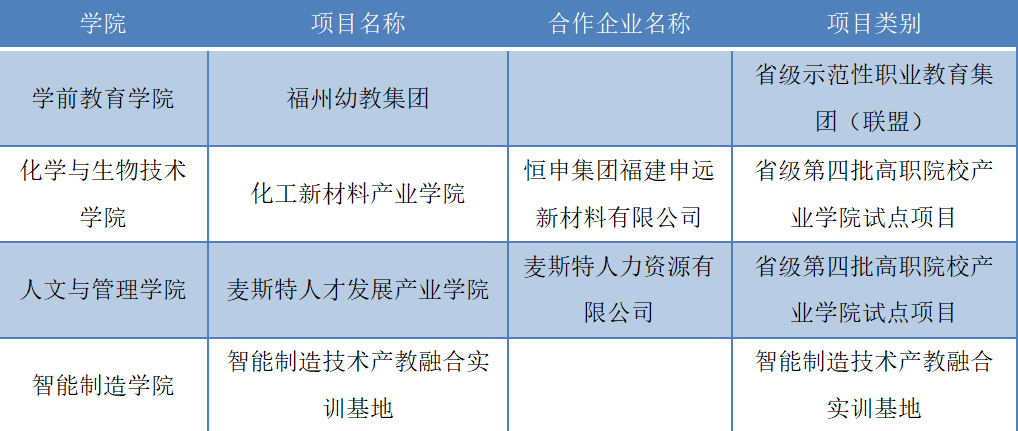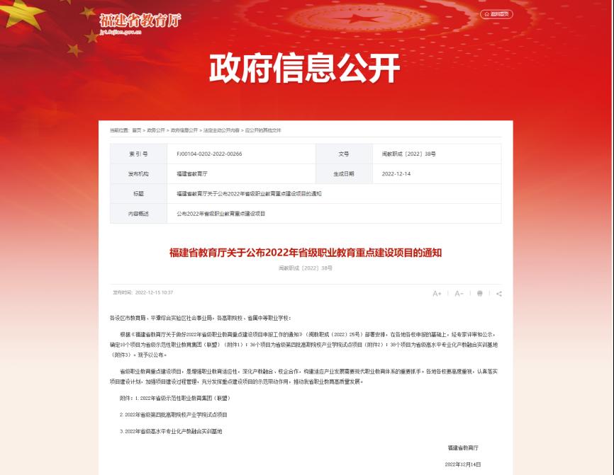 日前,福建省教育厅公布2022年省级职业教育重点建设项目,大赢家体育app下载学前教育学院的福州幼教集团入选2022年省级示范性职业教育集团(联盟);化学与生物技术学院的化工新材料产业学院、人文与管理学院的麦斯特人才发展产业学院立项为2022年省级第四批高职院校产业学院试点项目;智能制造学院的智能制造技术产教融合实训基地确认为省级高水平专业化产教融合实训基地。