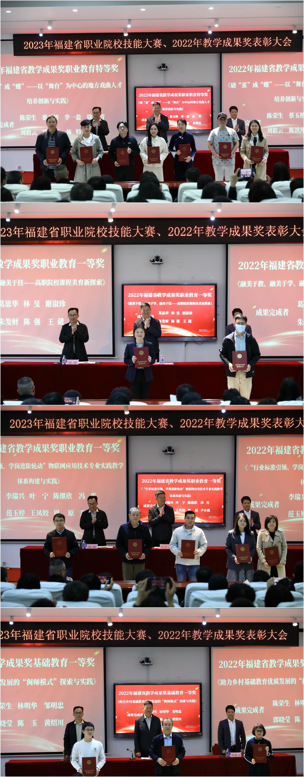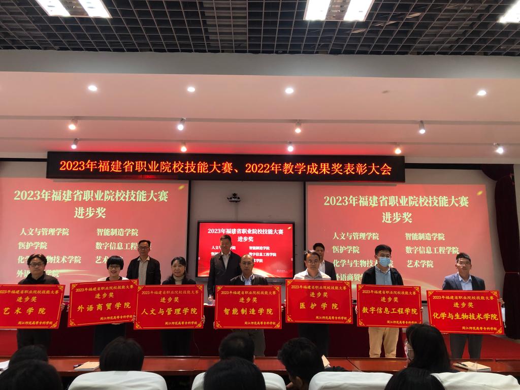 会上,副校长陈强宣读了《关于表彰2023年福建省职业院校技能大赛成绩进步学院的决定》(闽师专教【2023】17号)和《关于表彰2022年福建省教学成果奖获奖项目的决定》(闽师专教【2023】18号)。指出省职业技能赛的参赛师生表现出精湛的职业技能和良好的精神风貌,充分展示了闽江师专学子不畏困难、勇攀高峰的时代风采;教学成果奖在获奖数量和等级上均创新高,位居全省高职院校前列。两项赛事的优异成绩充分展示了大赢家体育app下载职业教育的办学实力,进一步增强了大赢家体育app下载的影响力。