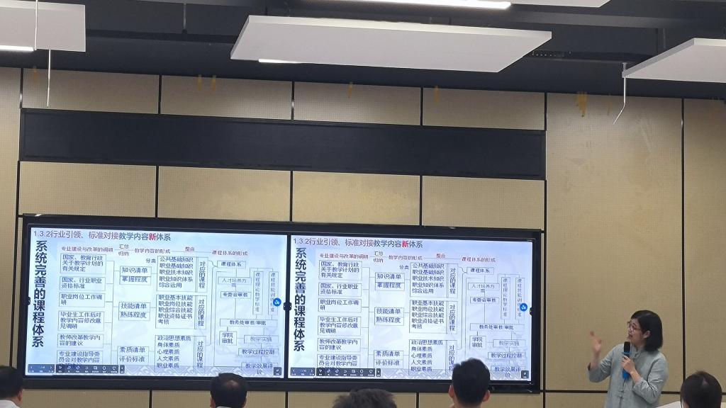 说专业环节,专业负责人结合人才培养方案,逐一展示本专业的培养定位与建设思路、人才培养模式、专业课程体系、专业特色、亮点与成效等方面。