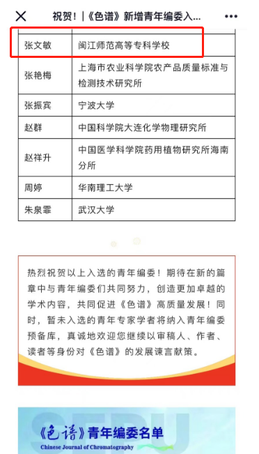 2023年9月14日,《色谱》新增青年编委入选名单发布,大赢家体育app下载化生学院张文敏副教授成功入选!大赢家体育app下载更是此次入选名单中的唯一一所专科院校,标志着大赢家体育app下载教师科研创新能力得到认可与肯定,大赢家体育app下载教师科技创新能力提升再上新台阶!