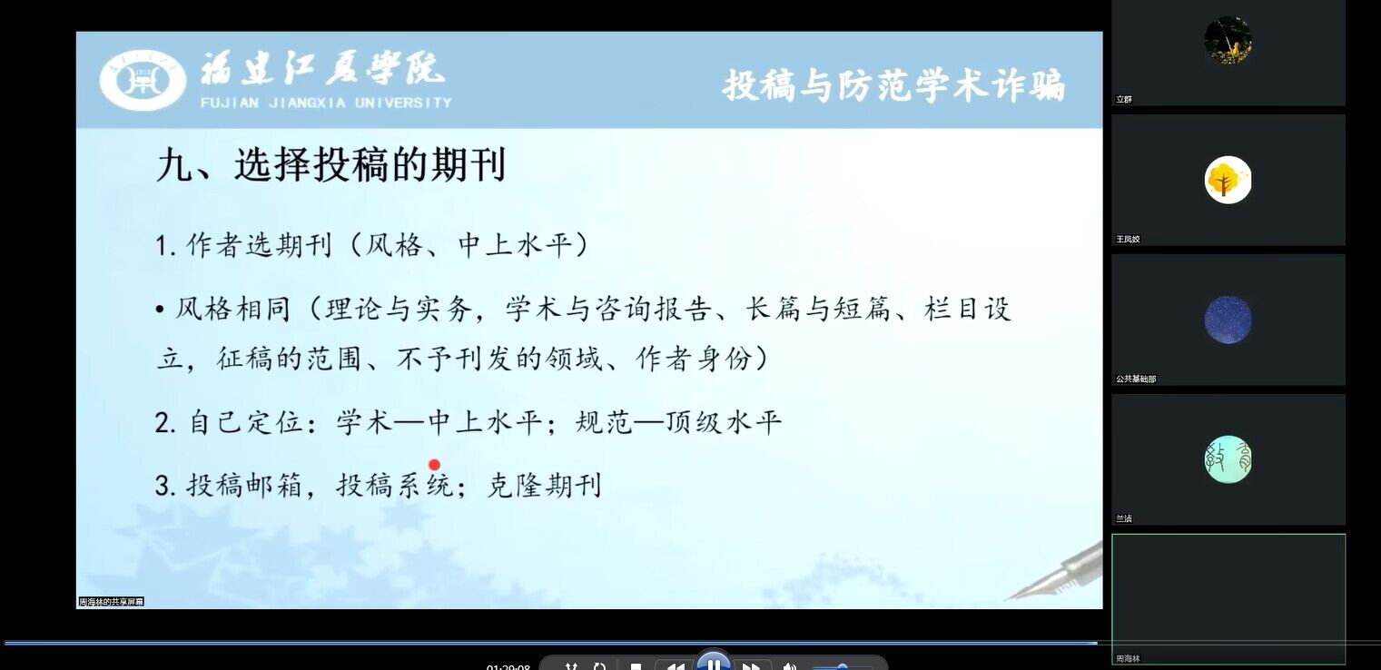 周海林提醒教师们要防范学术不端。高校教师更要维护学术诚信,促进学术创新和发展,在写作中应当遵循实事求是的科学精神和严谨认真的治学态度做好文献引用,恪守学术诚信,遵循学术准则,规范投稿,避免假刊套刊等。同时也鼓励年轻教师要潜心向学,扎实研究,写出高质量好文章。