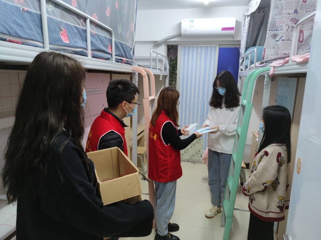 校园启动封闭管理后,人文与管理学院党总支及时召开疫情防控协调会议统筹部署,学院党政领导协同辅导员下沉学生宿舍,关心学生的网课学习情况和生活状态,及时协助解决学生网课期间遇到困难和需求。走访宿舍期间,教师党员志愿者向学生派发洗手液、消毒酒精、口罩等防疫物资,叮嘱学生要严格遵守学校疫情防控相关规定,引导他们做好宿舍卫生,养成良好的卫生习惯,保持积极心态,为学生安全健康保驾护航。